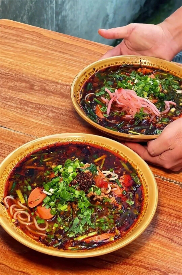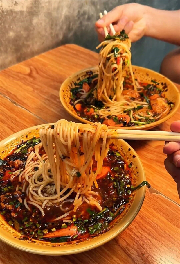 秘制肉酱、煳辣椒和新鲜时蔬,一碗专属美味就此诞生。先喝汤,鲜香直击味蕾,再嗦米线,滑溜中带着韧劲。不过片刻