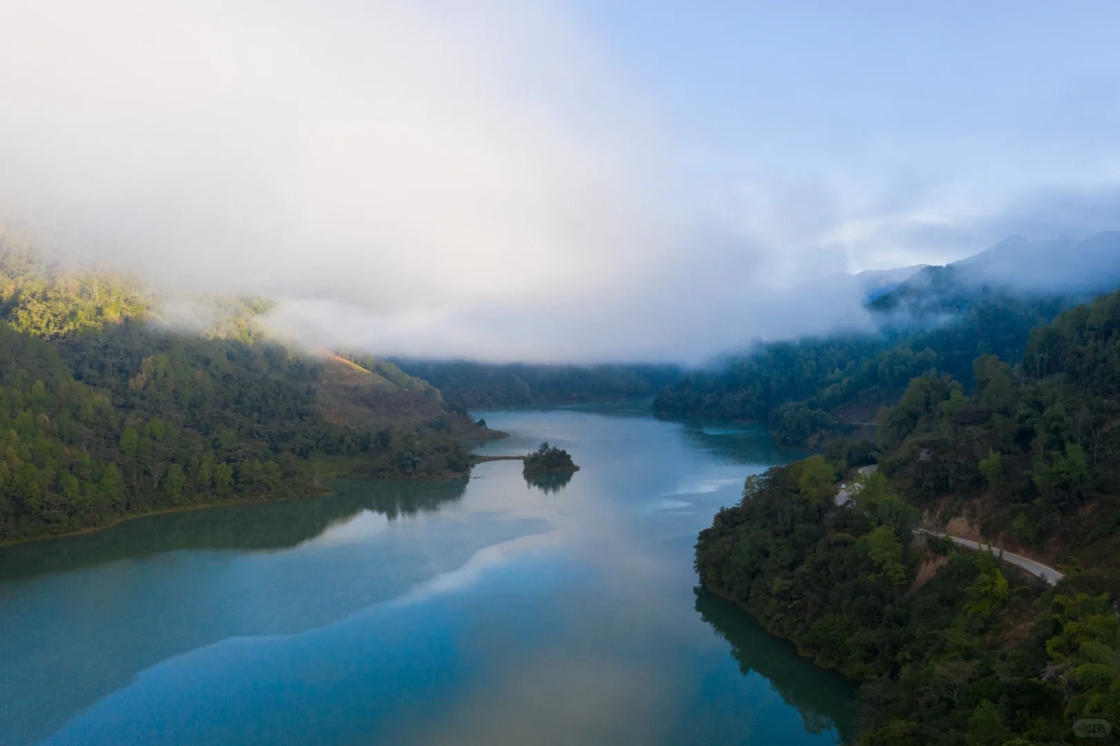 周围群山连绵,在澄澈蓝天的映衬下,展现出一派宁静悠远的景象。